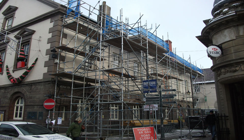 An access scaffolding plus stair tower and edge protection, built out of our Cuplock System Scaffolding for C & T Bain to enable them access to completely strip and lay a new roof to the Guildhall in Brecon.