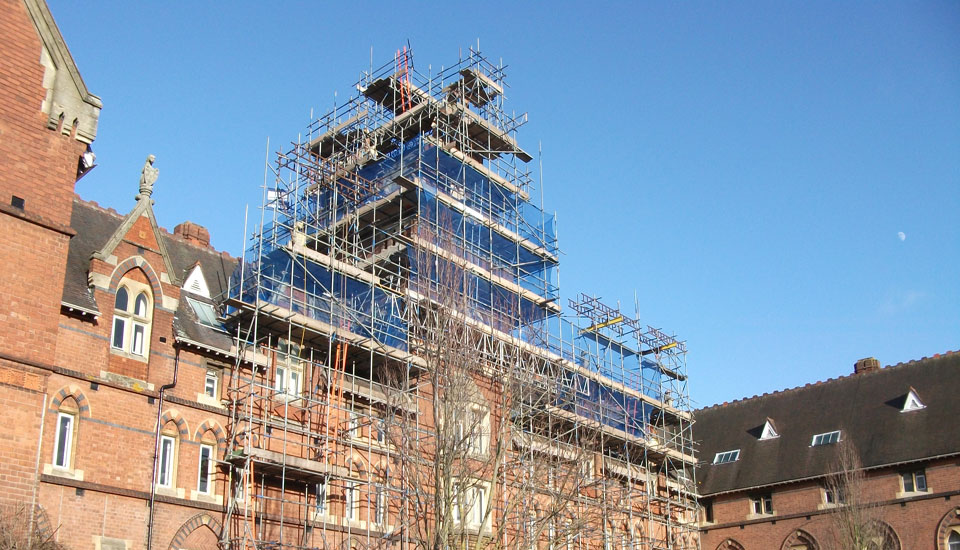 A full access scaffolding to the Main tower and Gargoyles at The Royal College of the Blind in Hereford with Incorporated RSJ lifting beams with roller blocks to move the heavy stone Gargoyles.